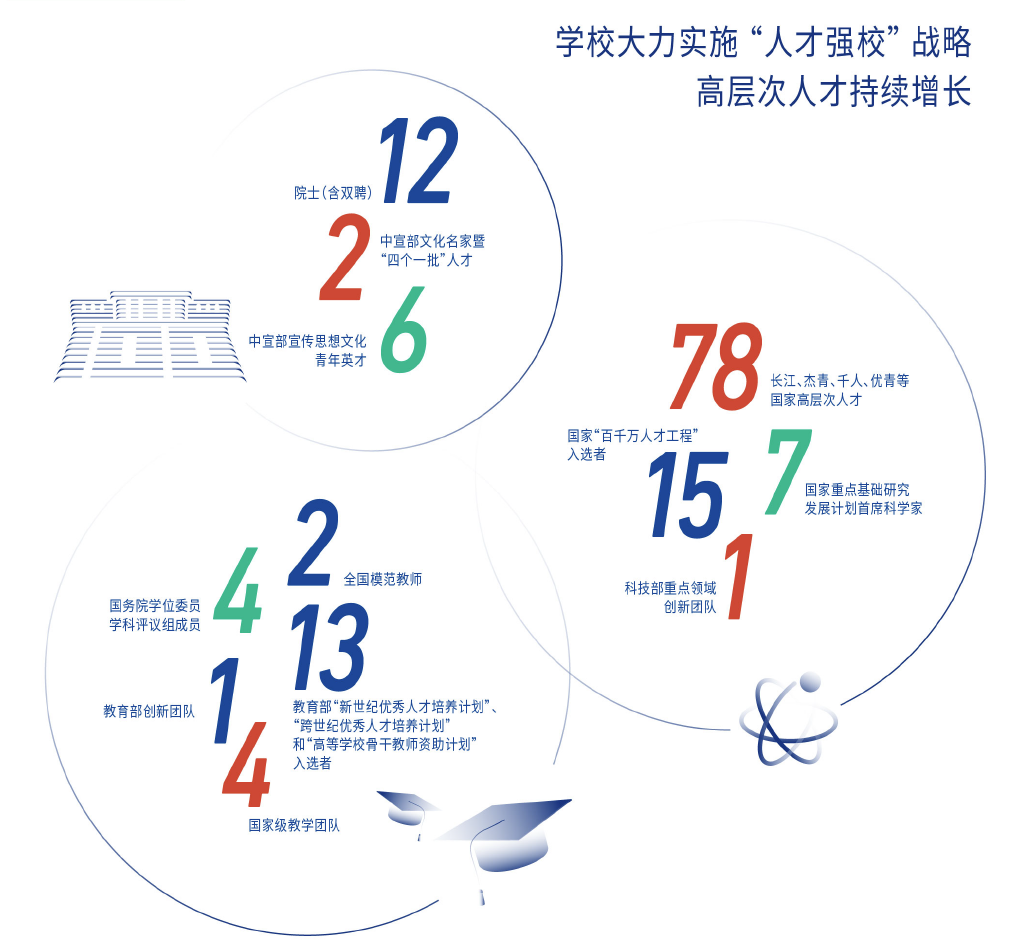 坚持学术兴校,教师科研竞争力、高水平成果产出能力大幅提高。国家社科基金立项数保持全国高校前10,2020年位列全国高校第3。国际顶级期刊Nature、Science、PNAS发文数连创新高,2019年中国大学CNS论文排行位列全国13。获国家自然科学二等奖1项、教育部高等学校科学研究优秀成果奖8项。实现国家重点实验室零的突破,新增一批国家级和教育部平台,新增1个科技部创新团队,入选首批全国10家铸牢中华民族共同体意识研究基地。