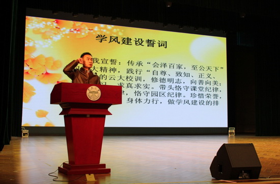 在民族学与社会学学院朱杰同学的带领下,全体2016年度奖学金获奖者郑重做出承诺:传承“会泽百家,至公天下”的云大精神,践行“自尊、致知、正义、力行”的云大校训,修德明志,向善向美;好学勤习,求真求实。带头恪守课堂纪律,恪守考试纪律,恪守园区纪律。珍惜荣誉,传播正能量;身体力行,做学风建设的排头兵!