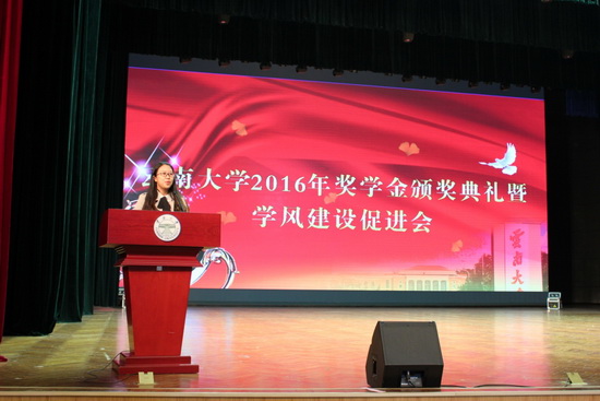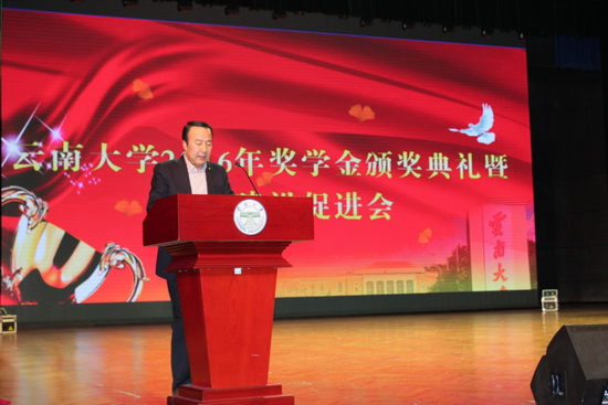 12月26日下午,云南大学2016年奖学金颁奖典礼暨学风建设促进会在呈贡校区学生会堂隆重举行,校党委常委、副校长王建华,校党委常委、副校长刘晓江、校学生工作指导委员会全体成员、各学院、研究生培养单位分管学生工作的领导、2016年度各项奖学金获奖学生代表参加了大会。大会由校党委委员、党委研究生工作部部长王启梁主持。