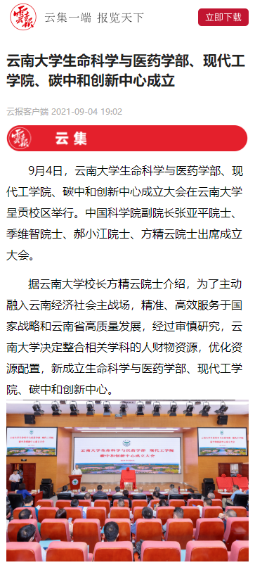 9月4日,云南大学生命科学与医药学部、现代工学院、碳中和创新中心成立大会在云南大学呈贡校区举行,媒体纷纷对成立大会进行了报道,特将部分媒体报道摘录如下:
